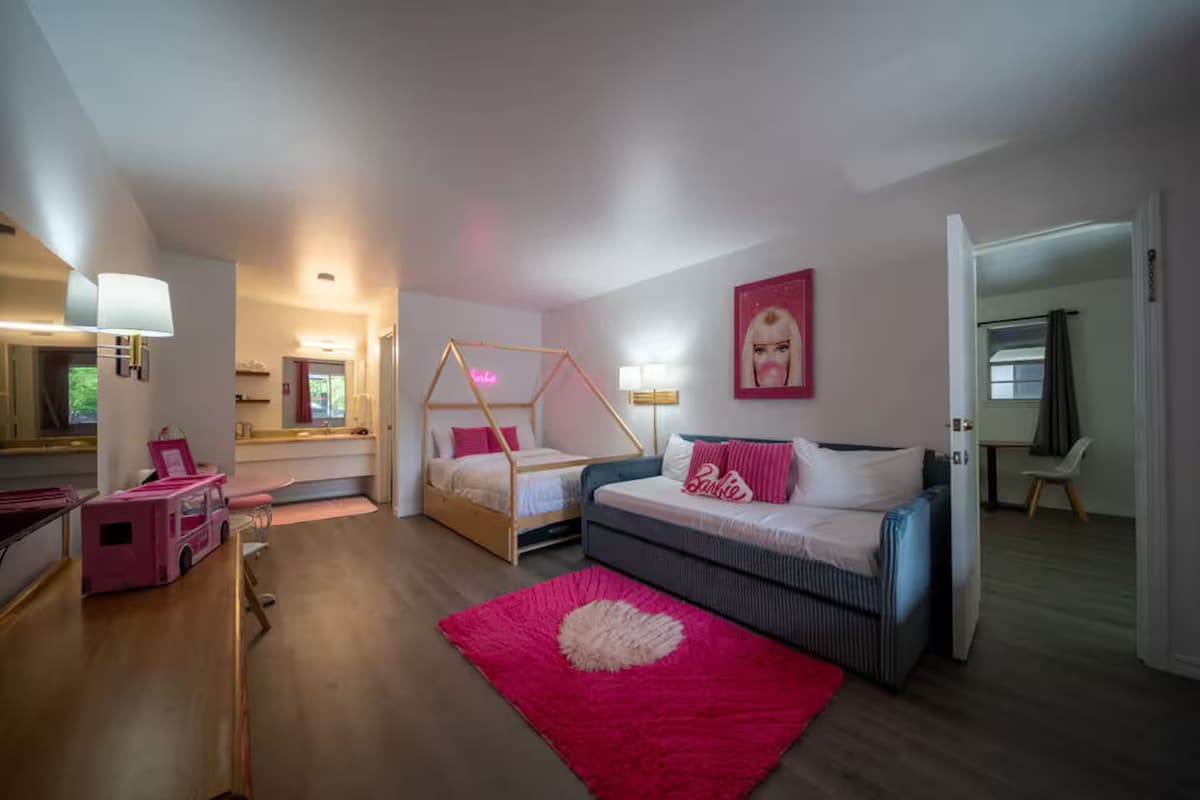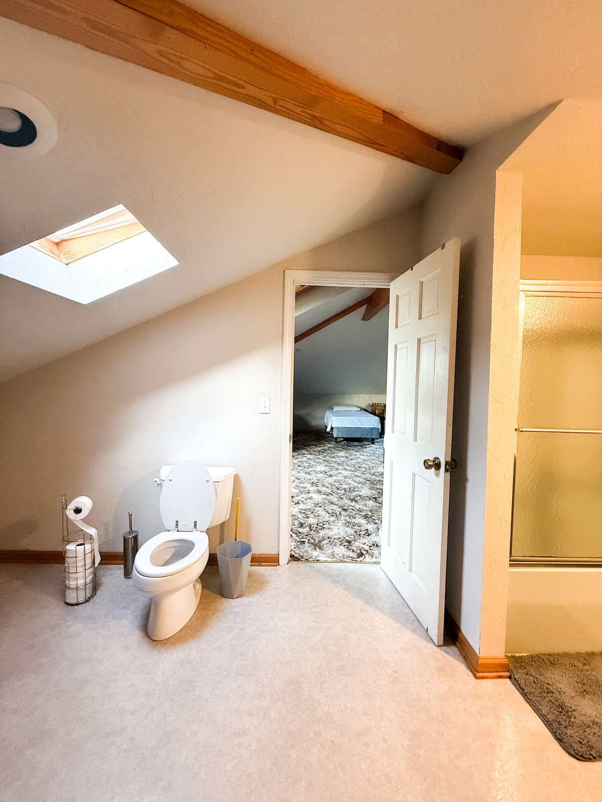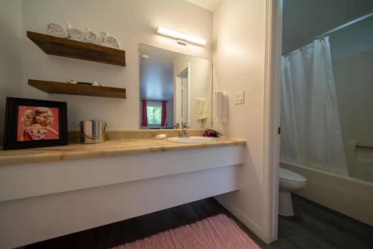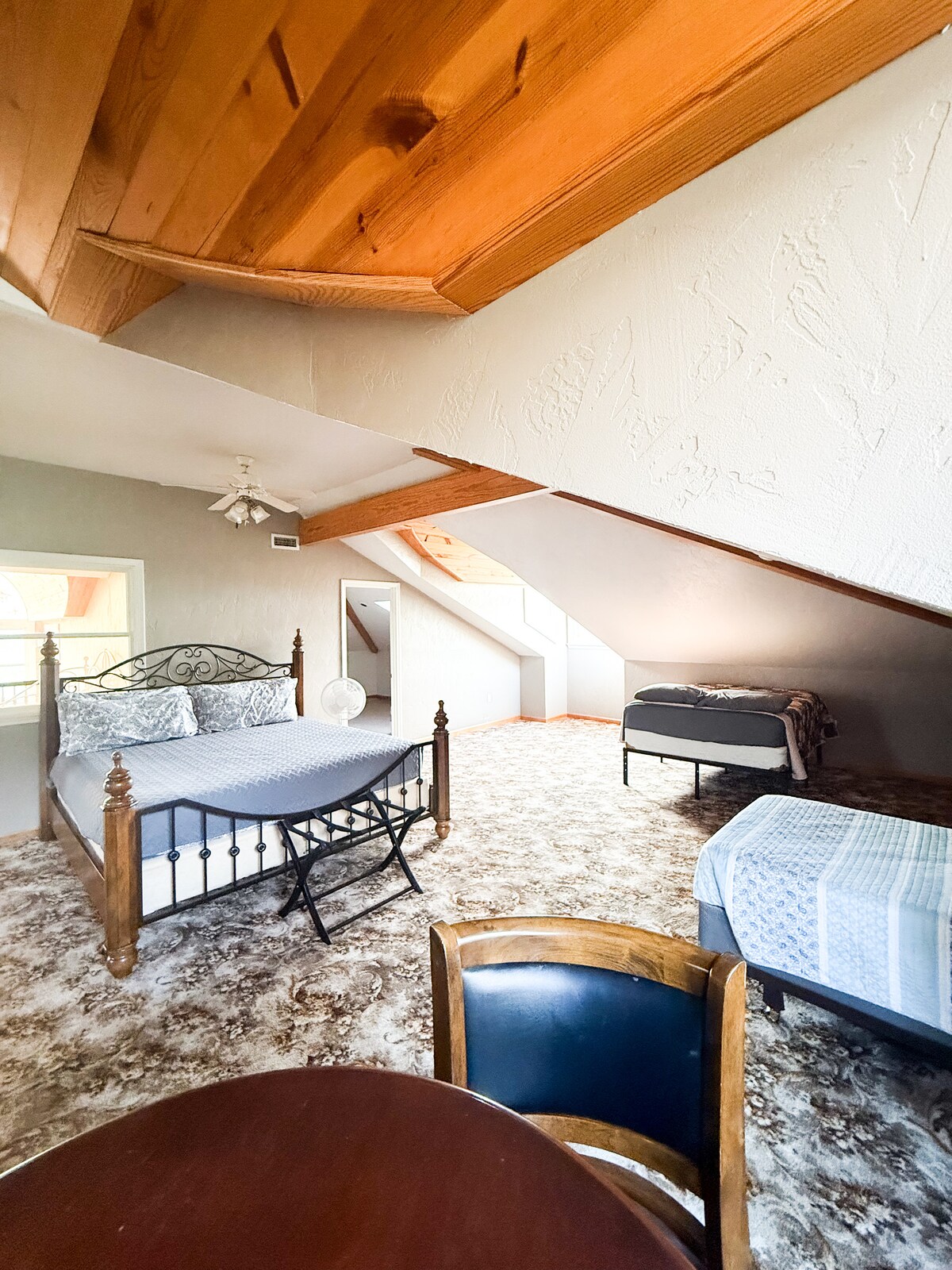 The cabin is situated at the front of the property, just 2 miles west of town on Highway 62, offering easy access yet a secluded feel. It's separate from yet connected to our main lodge, with a soundproofed, sealed room between them for privacy.