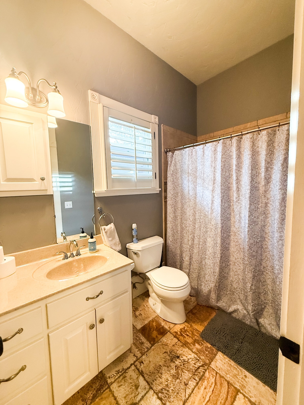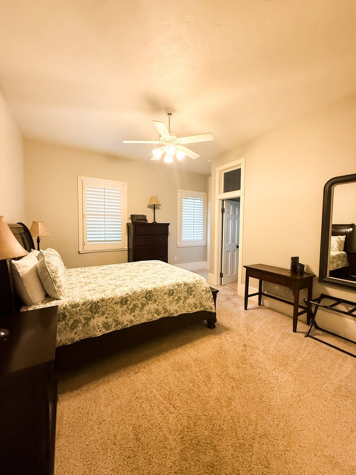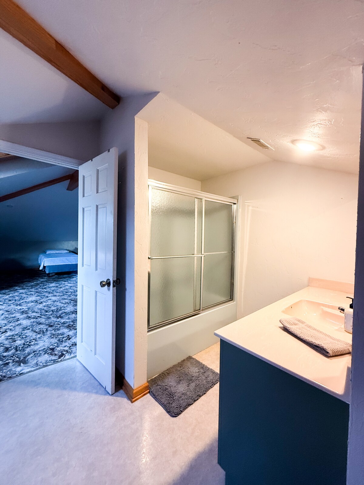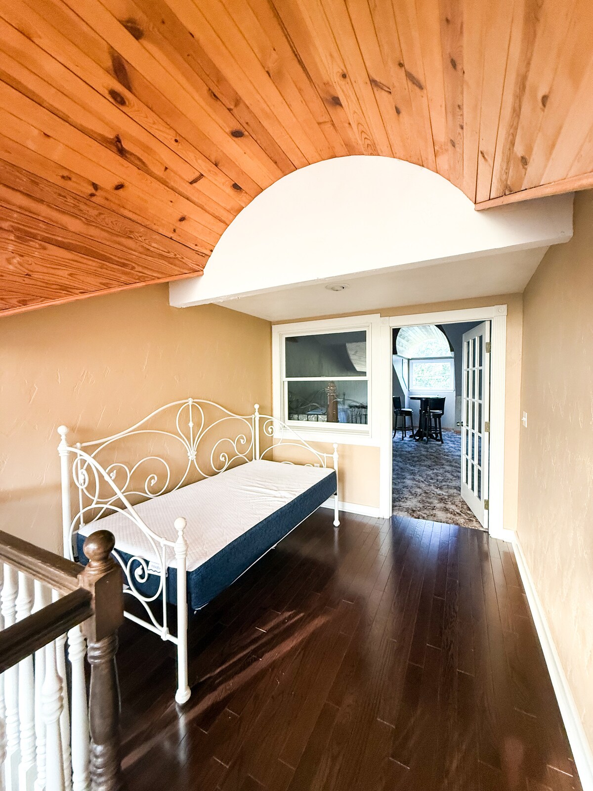 The cabin is situated at the front of the property, just 2 miles west of town on Highway 62, offering easy access yet a secluded feel. It's separate from yet connected to our main lodge, with a soundproofed, sealed room between them for privacy.