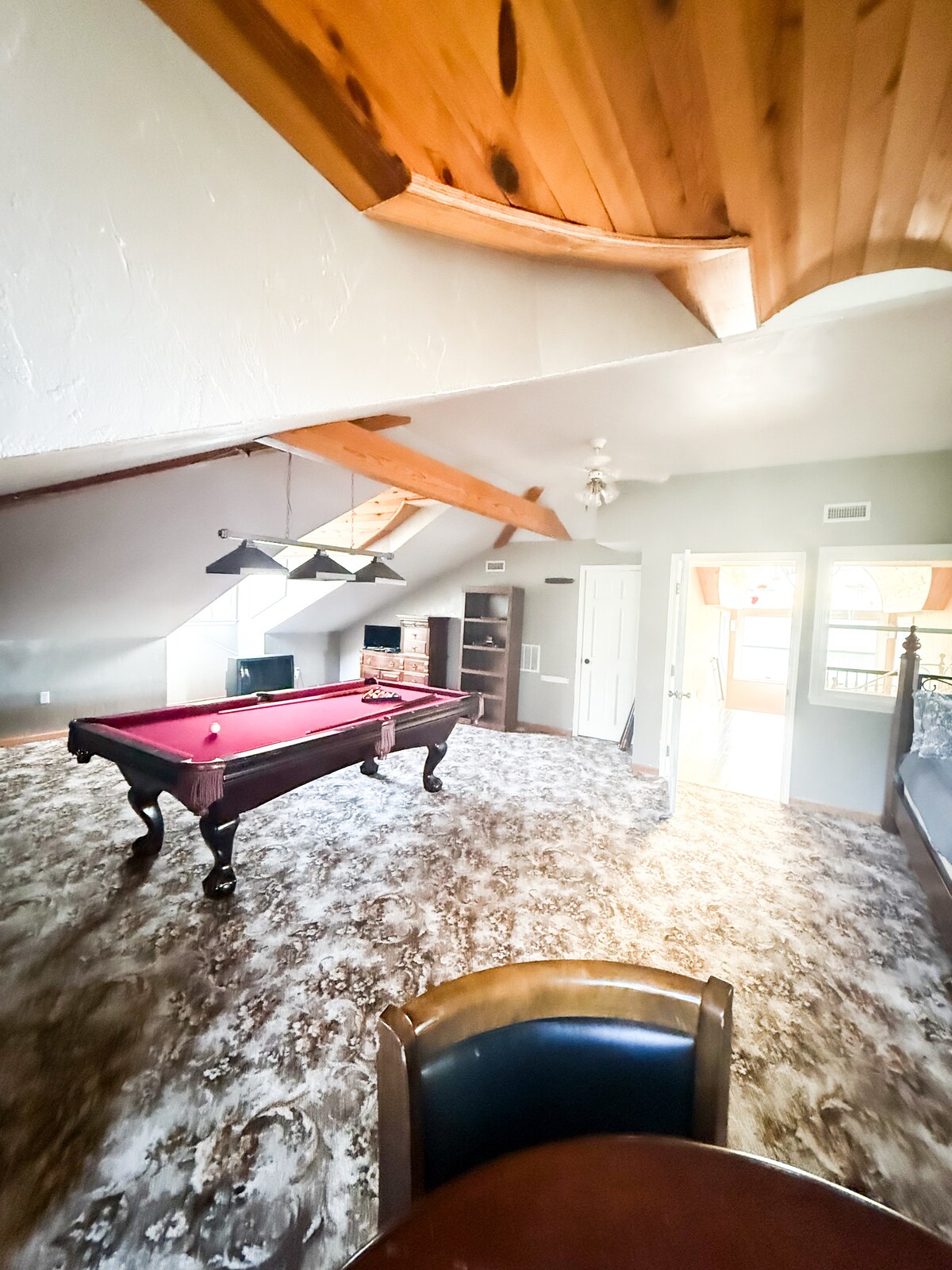 Private Mountain Top Manor offered by Bear Mountain Log Cabins, with phenomenal view of the White River. Large home 4200 square feet, with 4 bedrooms (1 king master upstairs and 3 queen bedrooms downstairs), 2 1/2 baths, Large jacuzzi in master bath, large living room upstairs and game room downstairs with pool table, foosball and ping pong table and large flat screen now with Starlink Wifi, 2 car garage and upper and lower decks for enjoying the incredible Mountain Top river view..Great for larger groups and families!