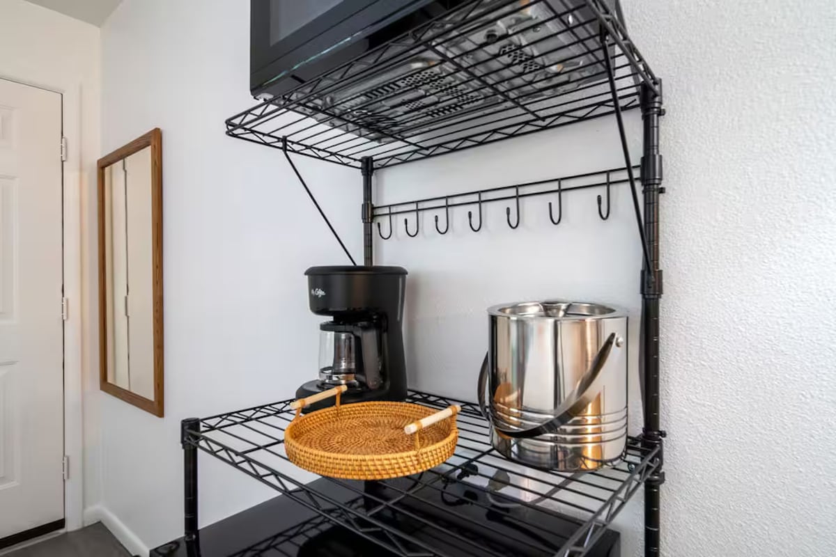 Escape to a charming Tudor-style cottage for your next nightly getaway, nestled just steps from the trolley stop near vibrant downtown Eureka Springs. This studio retreat welcomes you with a plush Dream Cloud king bed, perfect for unwinding after a day of exploration. The inviting space features a comfy chair and desk, a wood-burning fireplace to set the mood, and a 43-inch TV for your entertainment. Whip up quick meals or brew your morning coffee in the well-equipped kitchenette, complete with a refrigerator, sink, microwave, drip-style coffee maker, and toaster. Refresh in the spacious tile shower with large glass doors, designed for ultimate relaxation. Stay connected with free high-speed internet and enjoy year-round comfort thanks to ceiling fans and a mini-split heat and air system. This enchanting cottage blends historic charm with modern comforts, making it the ideal home base for your Eureka Springs adventure. **This unit has many steps down and back up from the parking lot**