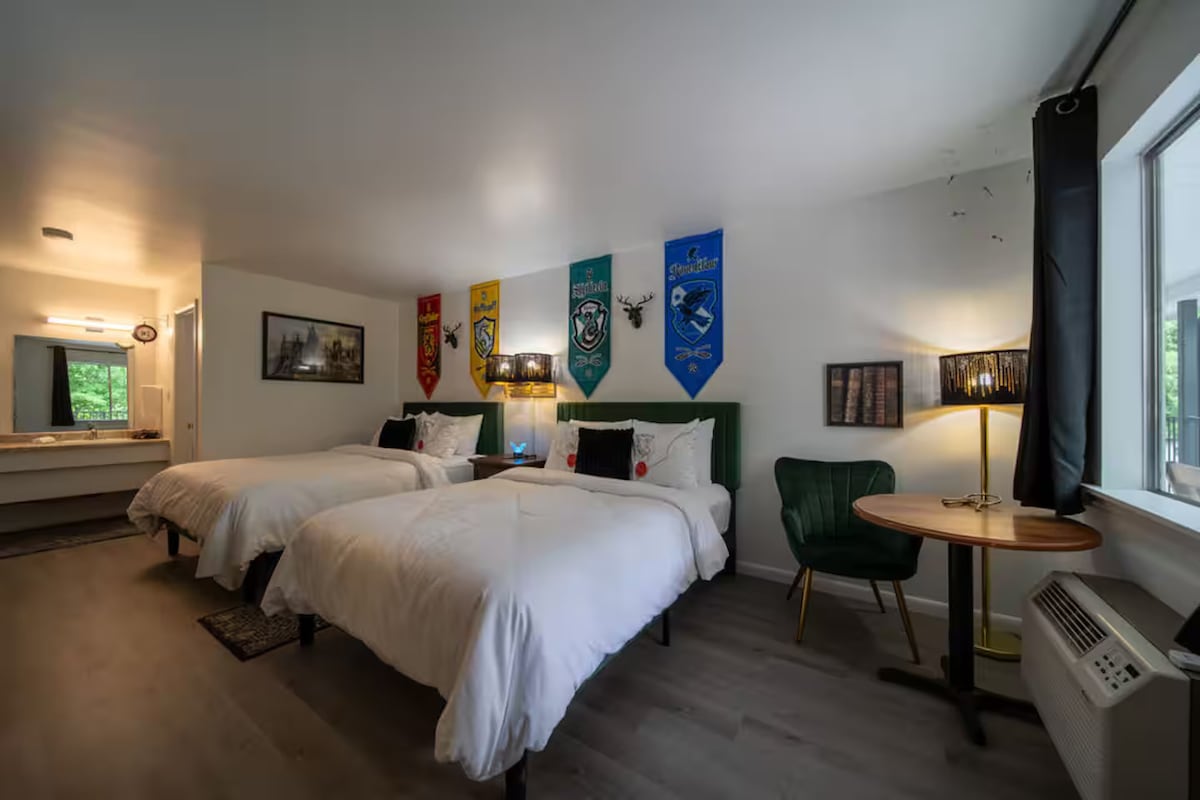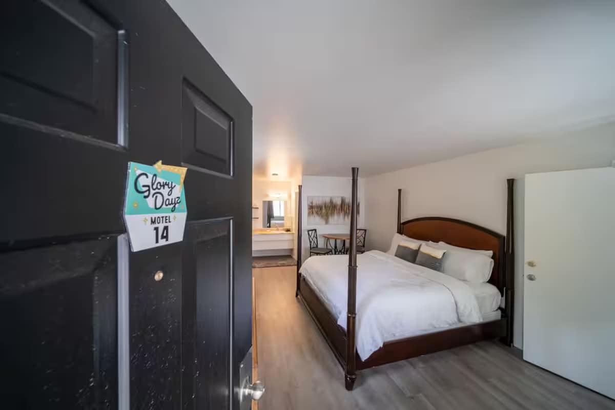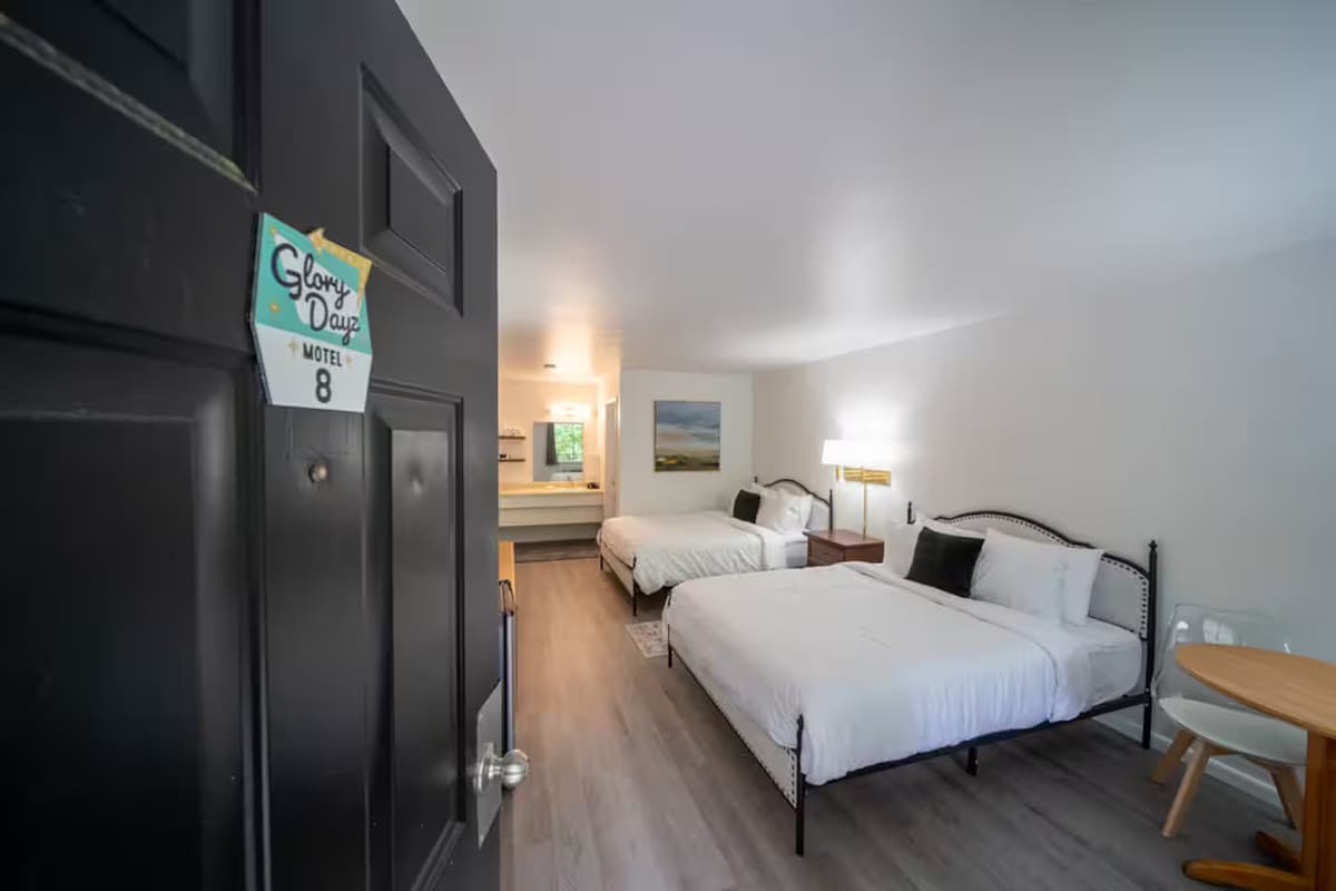 “The Carmel Nest”/#1 is located inside of the Oak Crest Motor Lodge at 526 W Van Buren, Eureka Springs, AR. It features 2 queen beds (one in a separate bedroom), kitchenette with mini refrigerator, microwave, and coffeemaker, private bathroom, and cable TV. Paved parking and a Trolley stop at location.