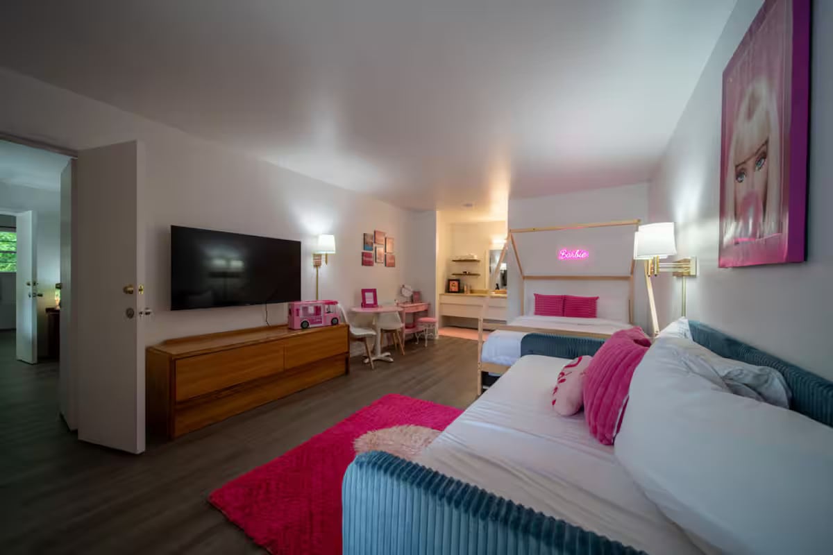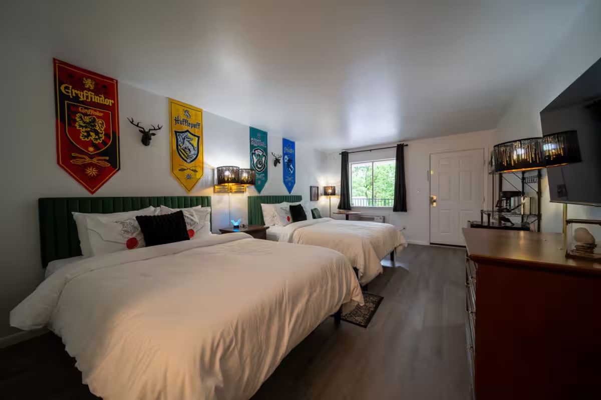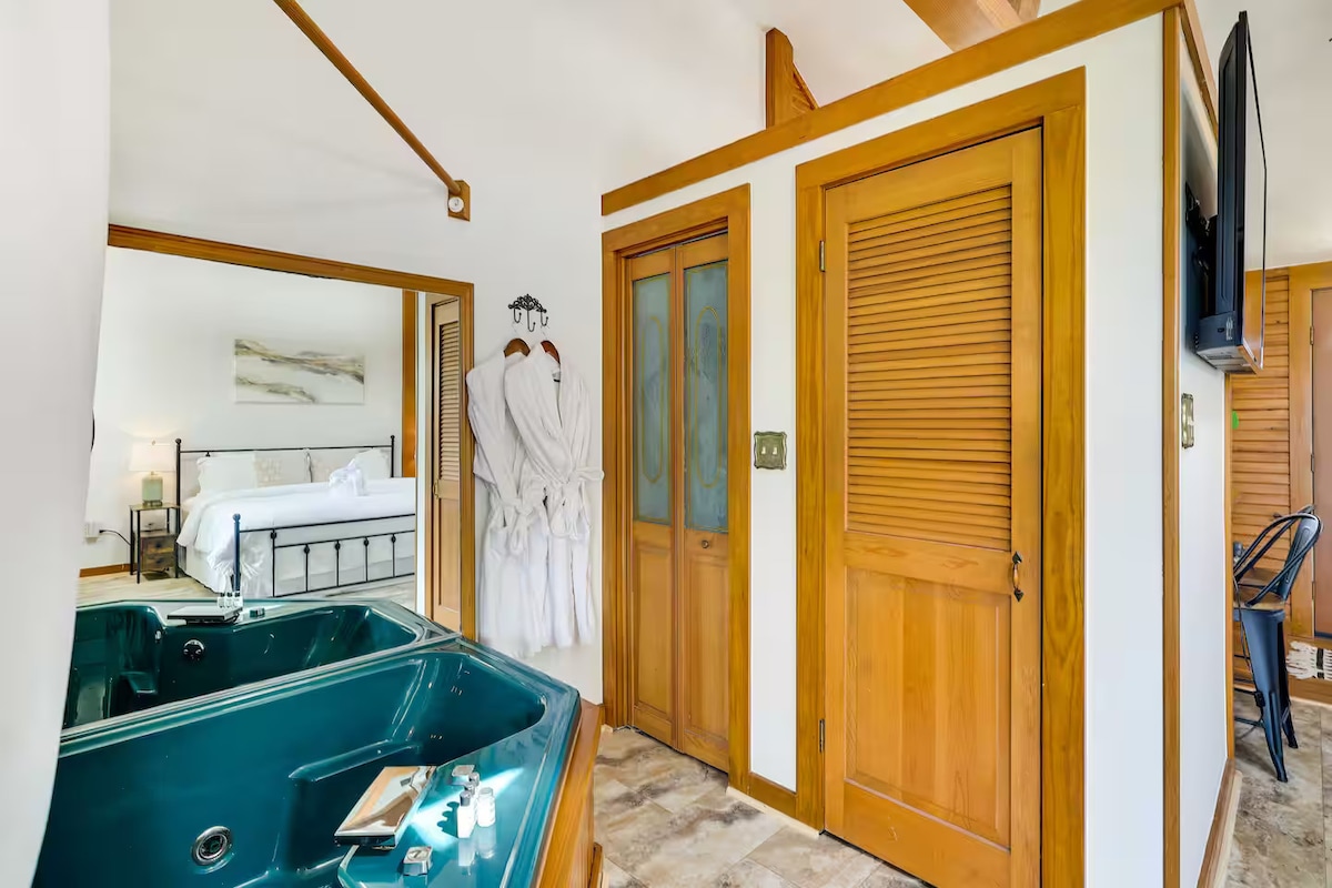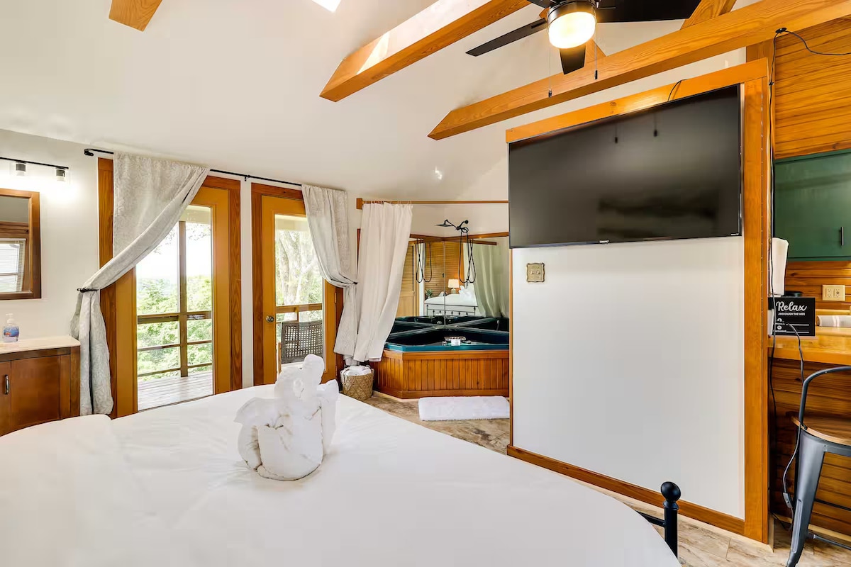 Escape to the treetops at Grand Treehouses, where modern luxury meets nature’s embrace. Featuring elevated walkways and exquisite design details, including stained-glass windows, hardwood floors, gas fireplaces, and chandeliers. The Unwind with premium amenities: a wet bar, 50" flat-screen TVs, free Wi-Fi, a plush King bed with luxury linens, cotton towels, a Jacuzzi tub for two, a glass walk-in shower, heated towel racks, a hair dryer, and heat and air.
