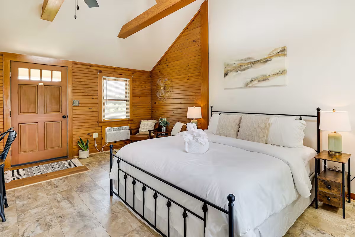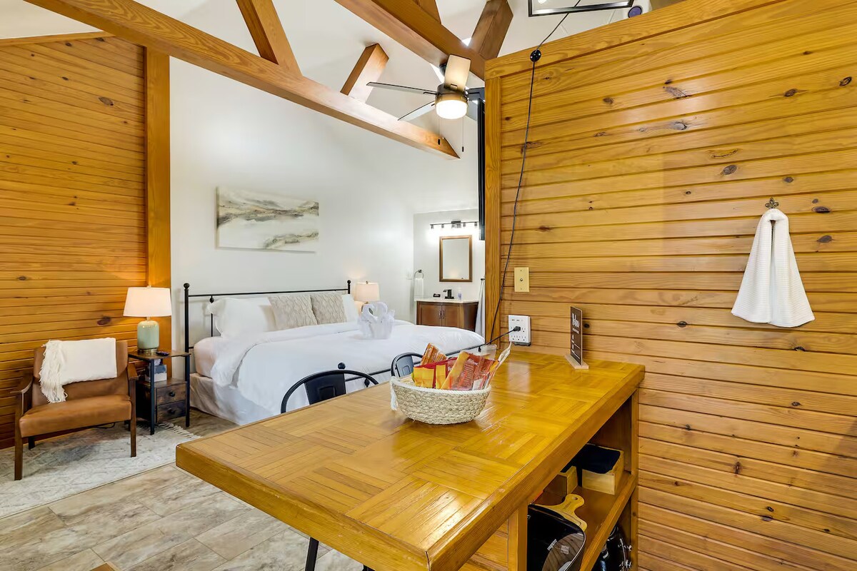 True Romance is here, experience stunning sunrise views from our most luxurious and spacious one-bedroom cabin nestled in a Pine tree grove. The cabin features: