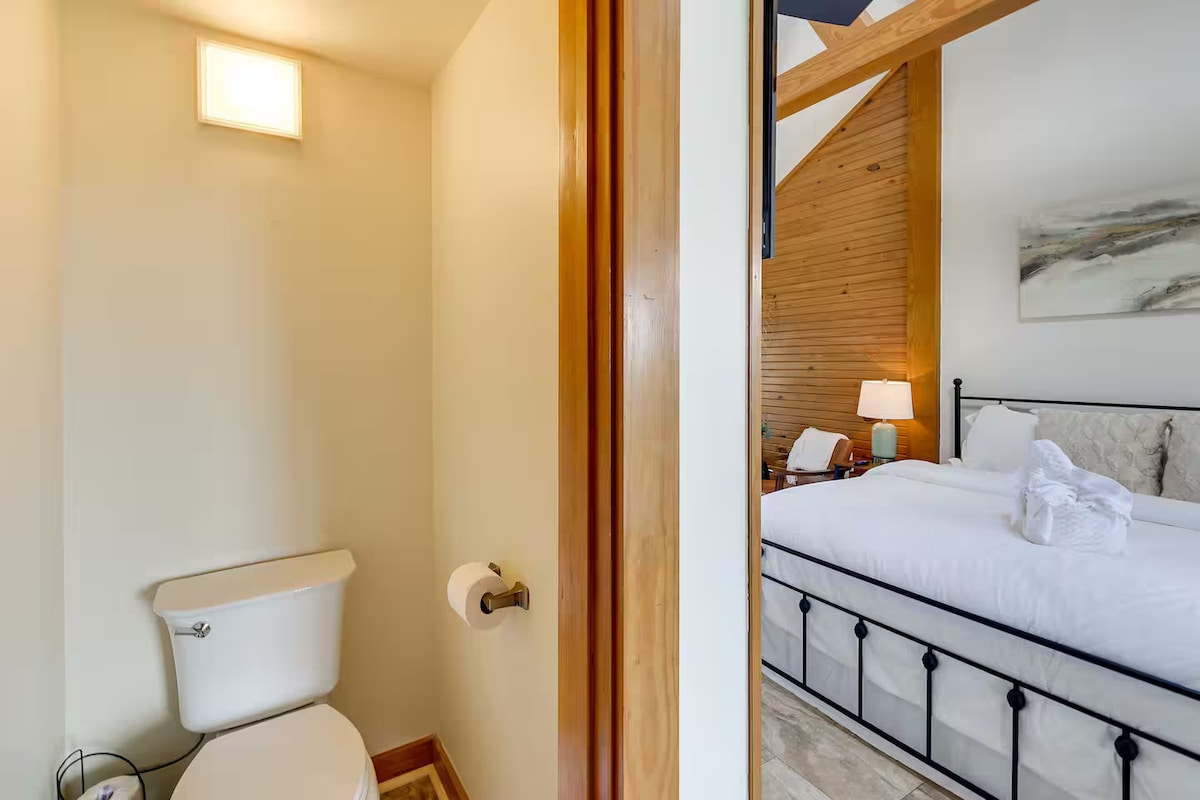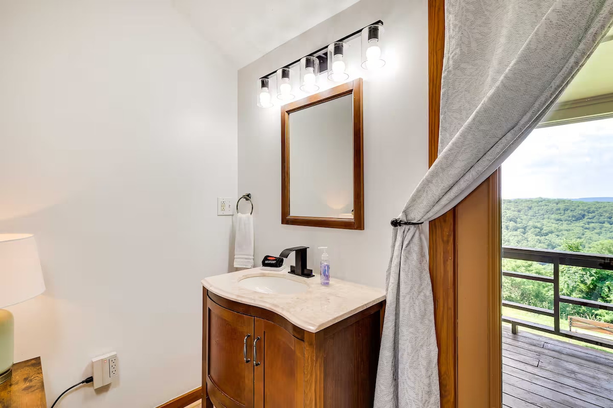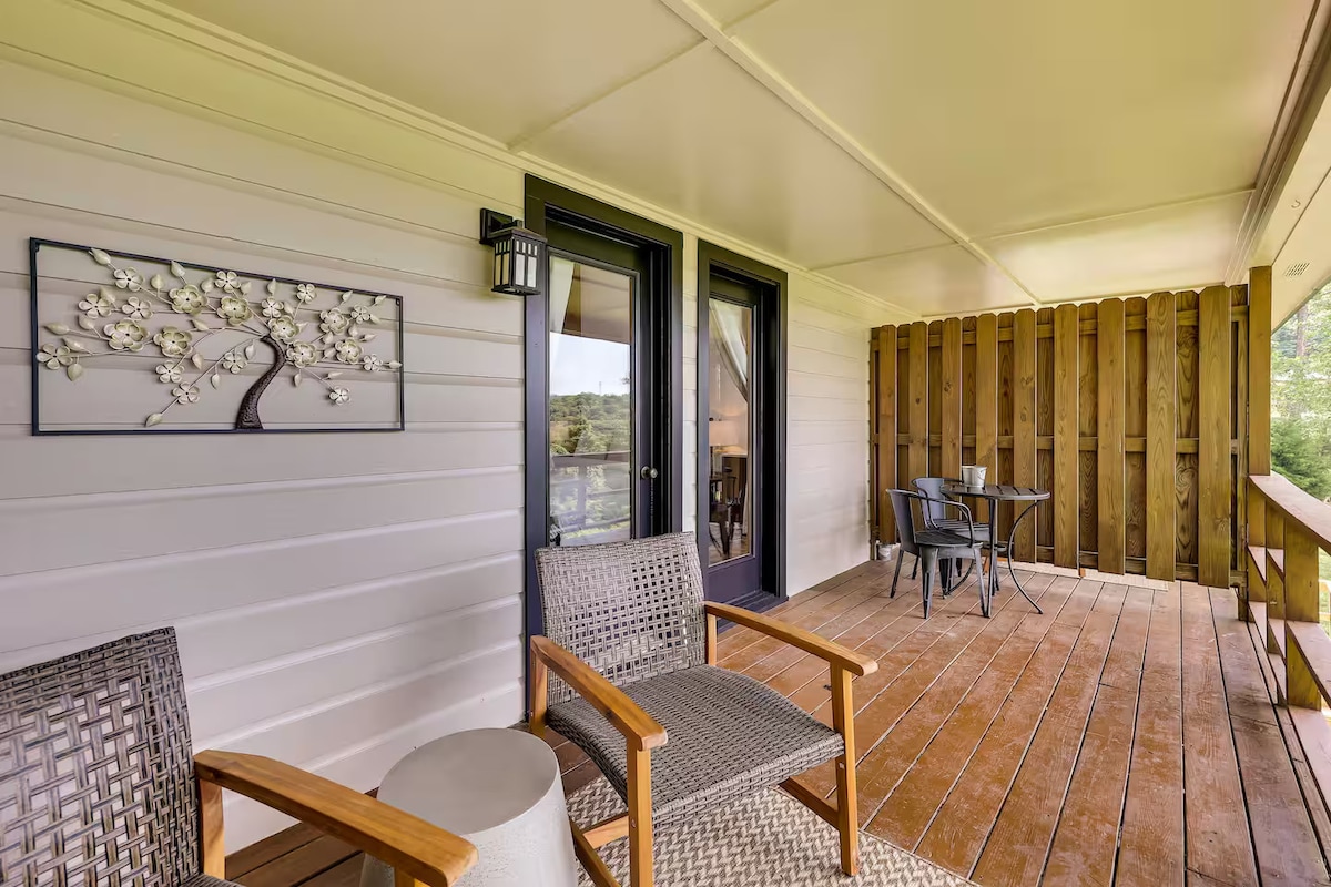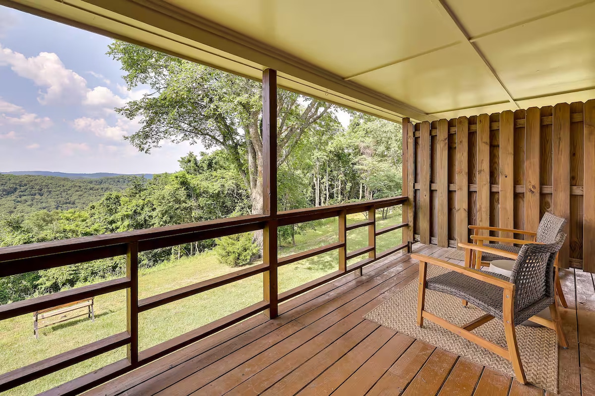 Hottub on deck - No Cleaning fee Romance awaits at Eagle Crest a luxurious two-story, one-bedroom cedar cabin with vaulted ceilings perched at the highest point of Wolf Ridge, providing breathtaking views of the White River. From the deck, you might catch a glimpse of bald eagles, known to fish in the river below. Cabin Layout:
