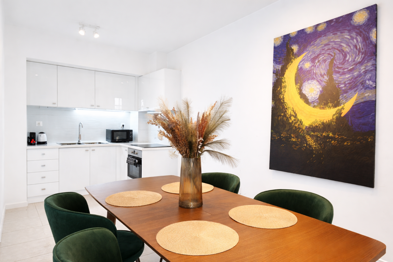 100 m² | 2 bedroom | 1 bathroom + 1 WC | 1st Floor | up to 4 persons | 2 double beds •The apartment is at the heart of the business center and very bright. It is very spacious 100 sq. m., located on the 1st floor. It includes:1. A spacious living room with with 50" 4K Smart TV (Netflix etc.) and a large 4 seat dinning table.2. Two separate bedrooms, 2 double beds - one in each bedroom. One bedroom has TV also.3. One bath with bathtub, one WC. Washing machine.4. Big quiet balconies. Exterior dining table.5. A kitchen with stoves and oven, Fridge, Nespresso, Kettle, Toaster, Microwave.6. All windows, including living room have external shutters.7. Heating and cooling in each room (3 devices) with inverter top quality AC's.L.R. 3240024